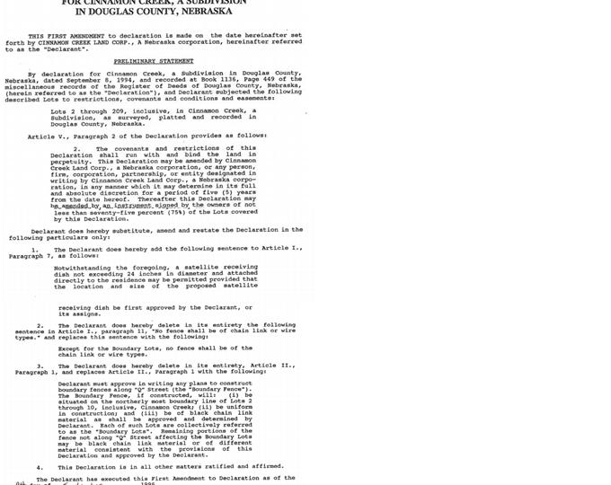 2. Covenant Amendments. The covenants and restrictions of the Declaration shall run with and bind the land in perpetuity. This Declaration may be amended by Cinnamon Creek Land Corp., a Nebraska corporation, or any person, firm, corporation, partnership, or entity designated in writing by Horgan Development Company, a Nebraska corporation, in any manner which it may determine in its full and absolute direction for a period of five (5) years from the date hereof. Thereafter this Declaration may be amended by an instrument signed by the owners of not less than seventy-five (75%) of the Lots covered by this Declaration.